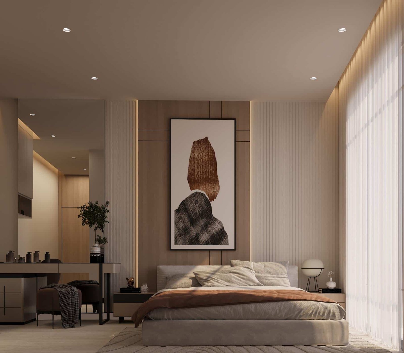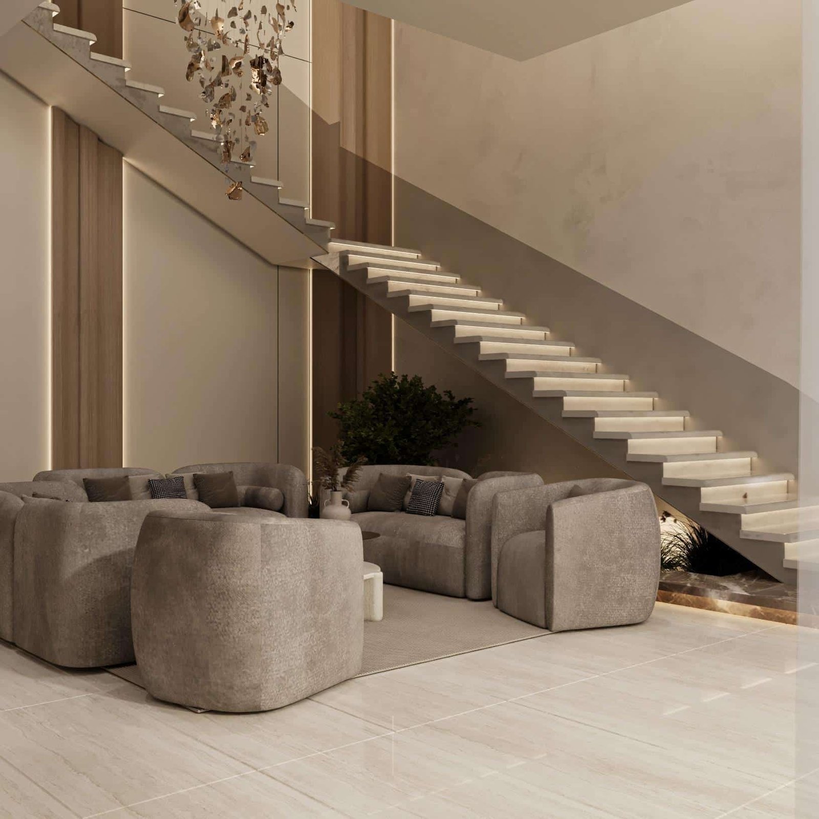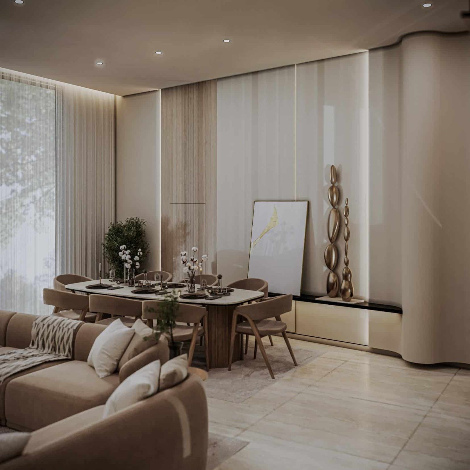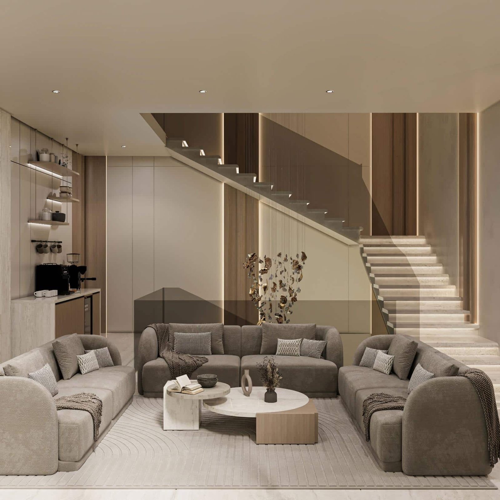 تجسد فيلا أصالة الدرعية في الرياض مفهوماً للتصميم الداخلي يركز على الهدوء والسكينة المطلقة، مستلهماً هويته العميقة من أصالة الدرعية وطابعها الطبيعي الدافئ. تمثلت استراتيجيتنا في صياغة مساحة داخلية متجردة من التعقيد، حيث اعتمدنا على تدرجات لونية فاتحة ومواد طبيعية خشبية وحجرية فاخرة، لتعزيز الشعور بالاتصال بالطبيعة وتوفير ملاذ حقيقي للعميل من صخب المدينة. هذا التوجه لا يخلق فقط بيئة داخلية مريحة جداً وهادئة تمنح راحة نفسية وعمقاً بصرياً، بل يضمن أيضاً متانة التشطيبات وسهولة صيانتها بفضل استخدام المواد الطبيعية، مما يرفع من عمر الفراغ الداخلي ويجعله استثماراً عملياً في جودة وراحة الحياة اليومية.