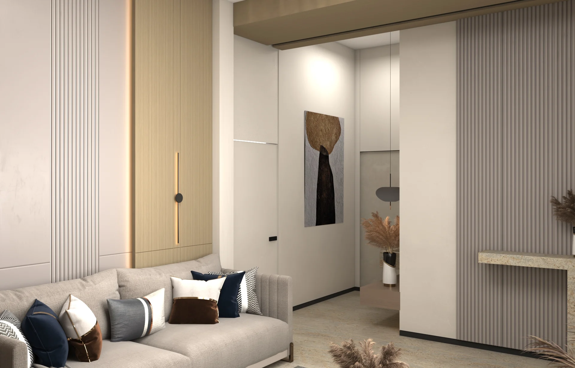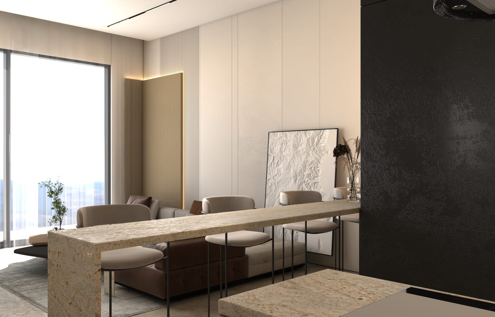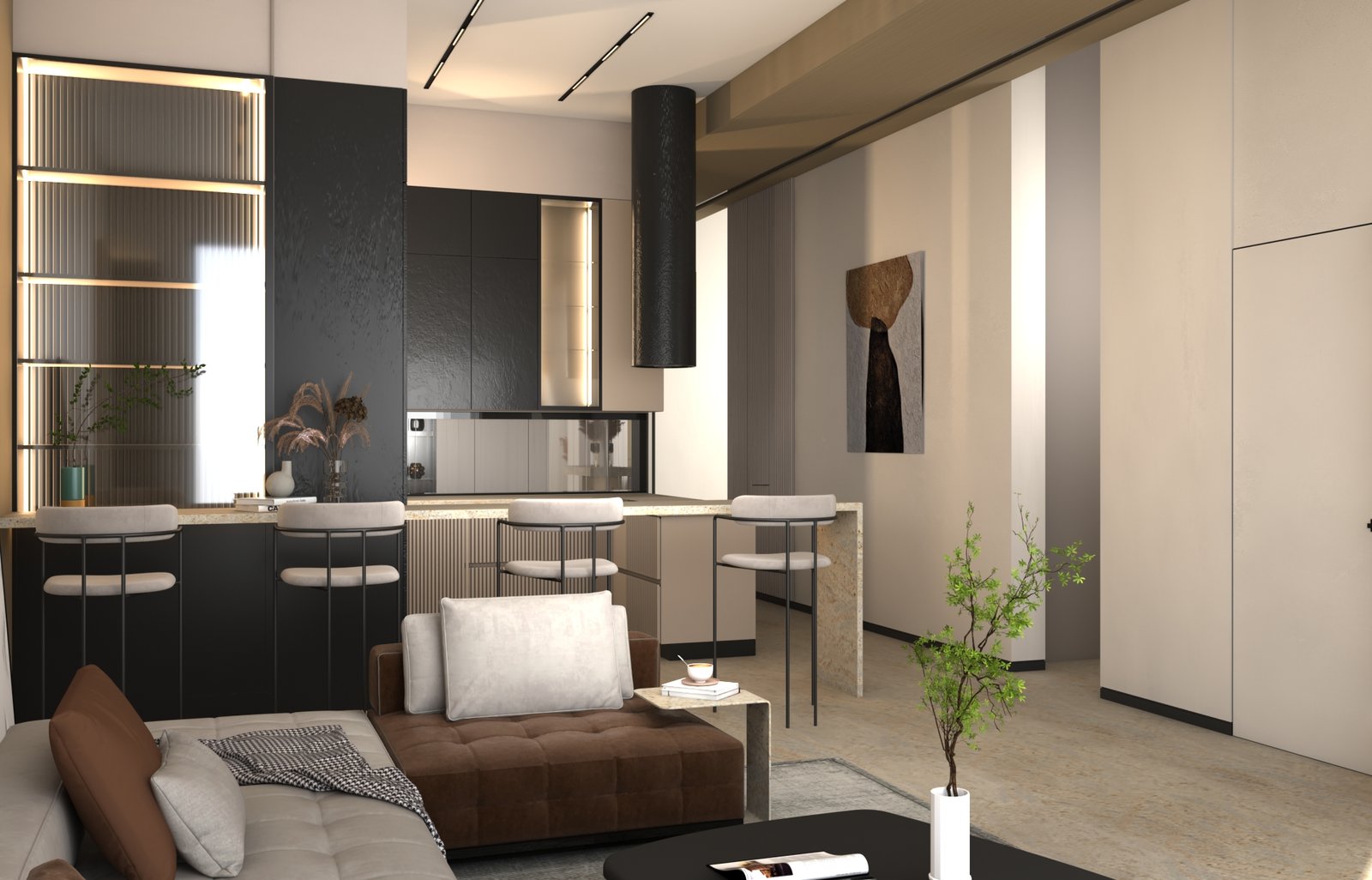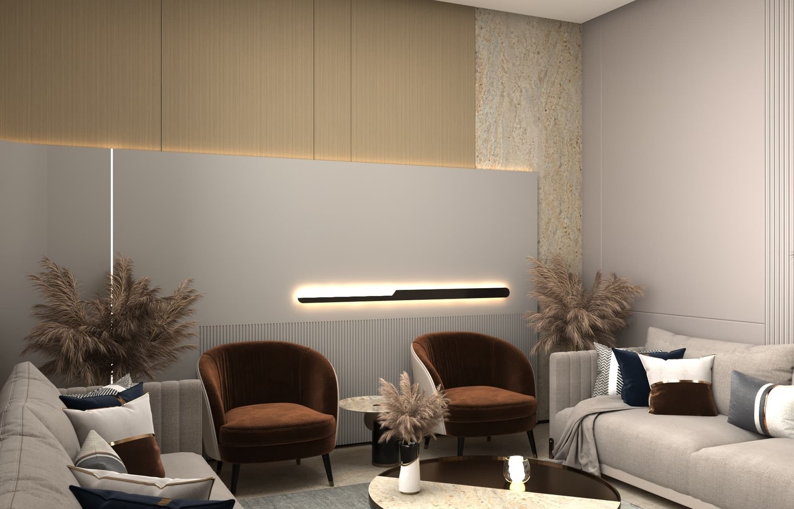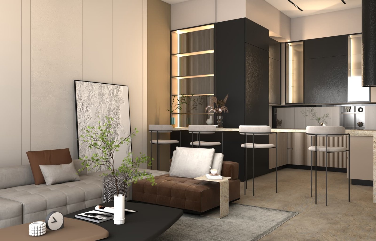 يتبنى مشروع مقام فلسفة تصميم داخلي تجمع ببراعة بين الهدوء العصري في بعض الفراغات (كالمطابخ والأركان ذات الألوان الفاتحة) والدراما البصرية الفاخرة في فراغات أخرى (كغرف المعيشة والنوم الرئيسية). تتميز الشقة بتنوع استخدام الخامات الراقية؛ حيث نجد الرخام الفاتح ذو العروق البارزة، والأخشاب الداكنة والجدران المُغطاة بألواح خشبية عميقة اللون. في الغرف الهادئة، تُستخدم الألوان المحايدة الدافئة مع لمسات إضاءة خفية لتعزيز الشعور بالسكينة والعملية. بينما في الفراغات الجريئة، يتم التركيز على الأثاث المترف ذي الخطوط العميقة والمنحنية، واللمسات المعدنية المصقولة (كالذهب والنحاس) التي تظهر في الإضاءة المركزية والتفاصيل الجانبية. هذا التباين المدروس يمنح الشقة هوية بصرية قوية ومزدوجة، تجمع بين الوظائفية اليومية في إطار من الرفاهية المتميزة.