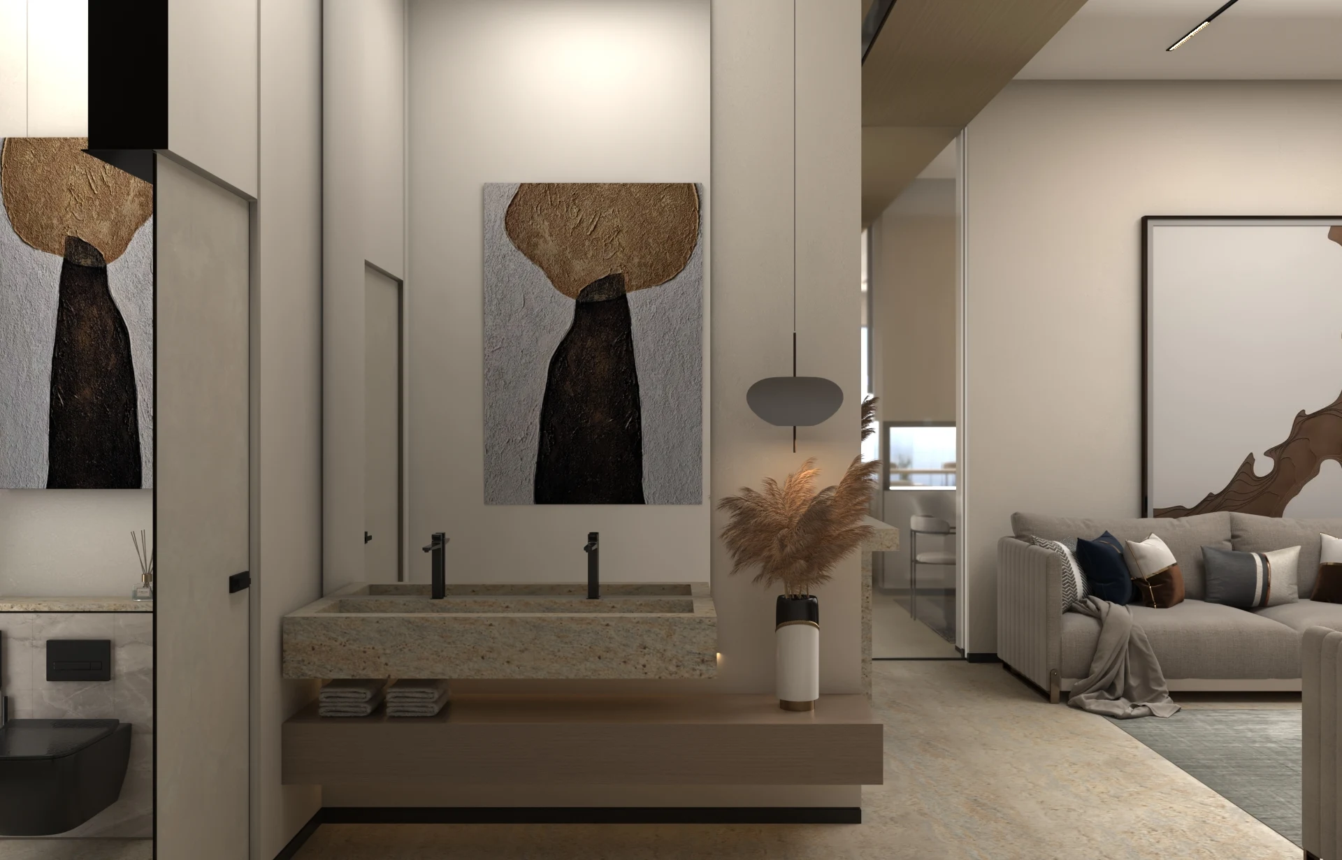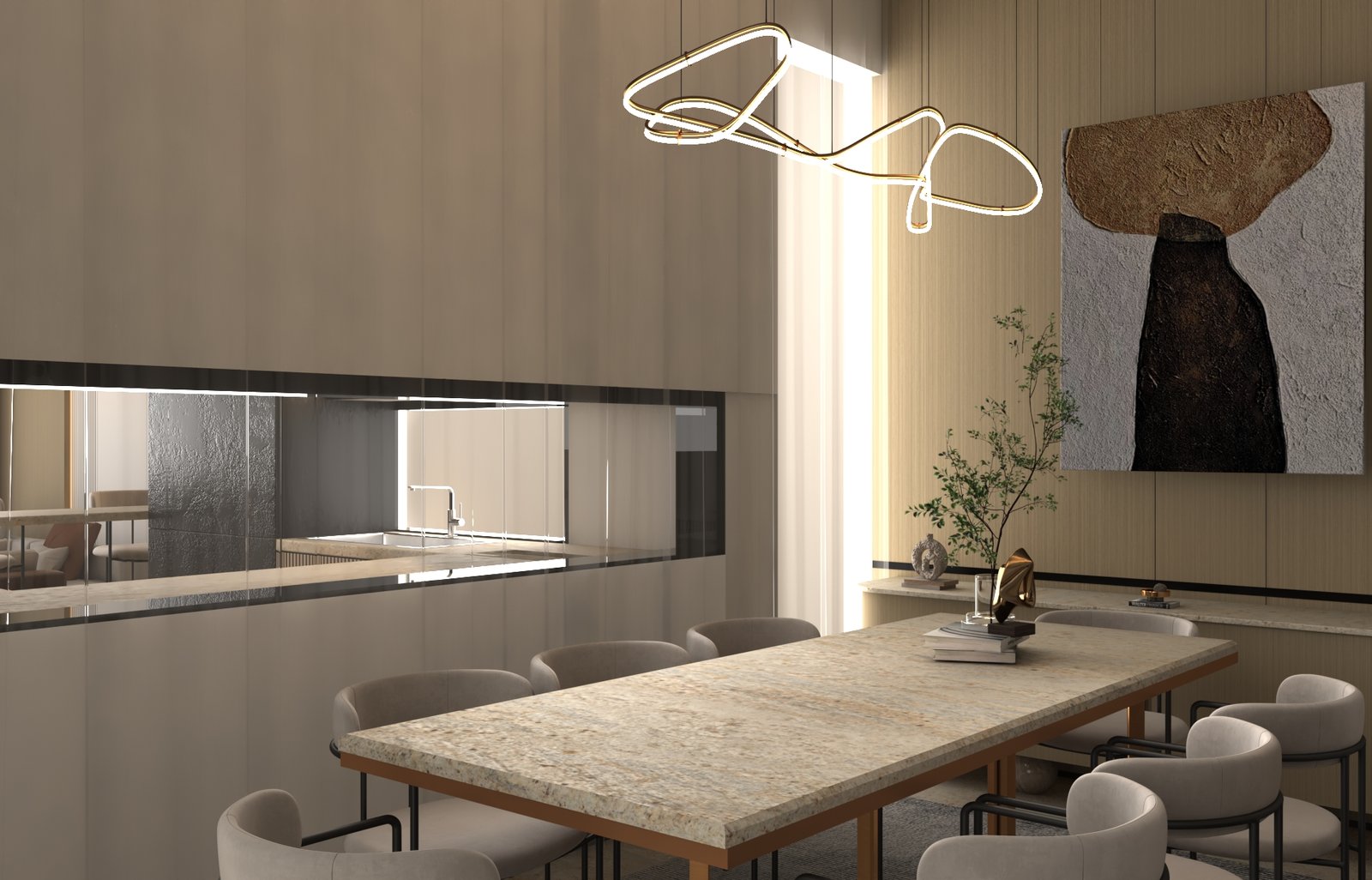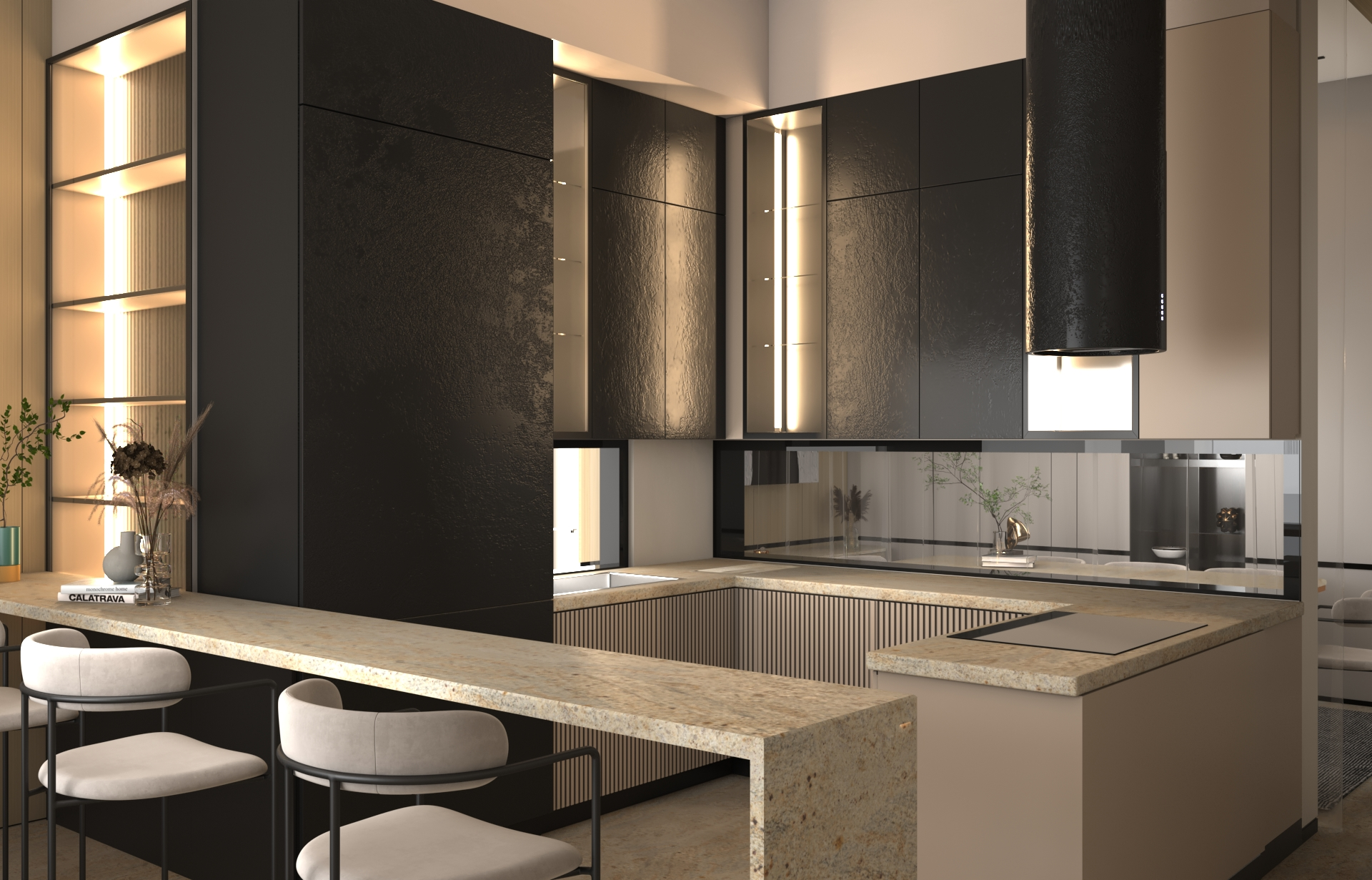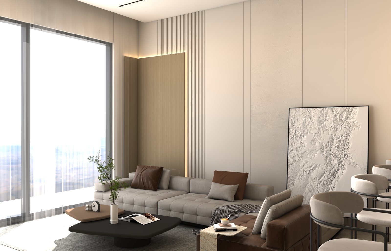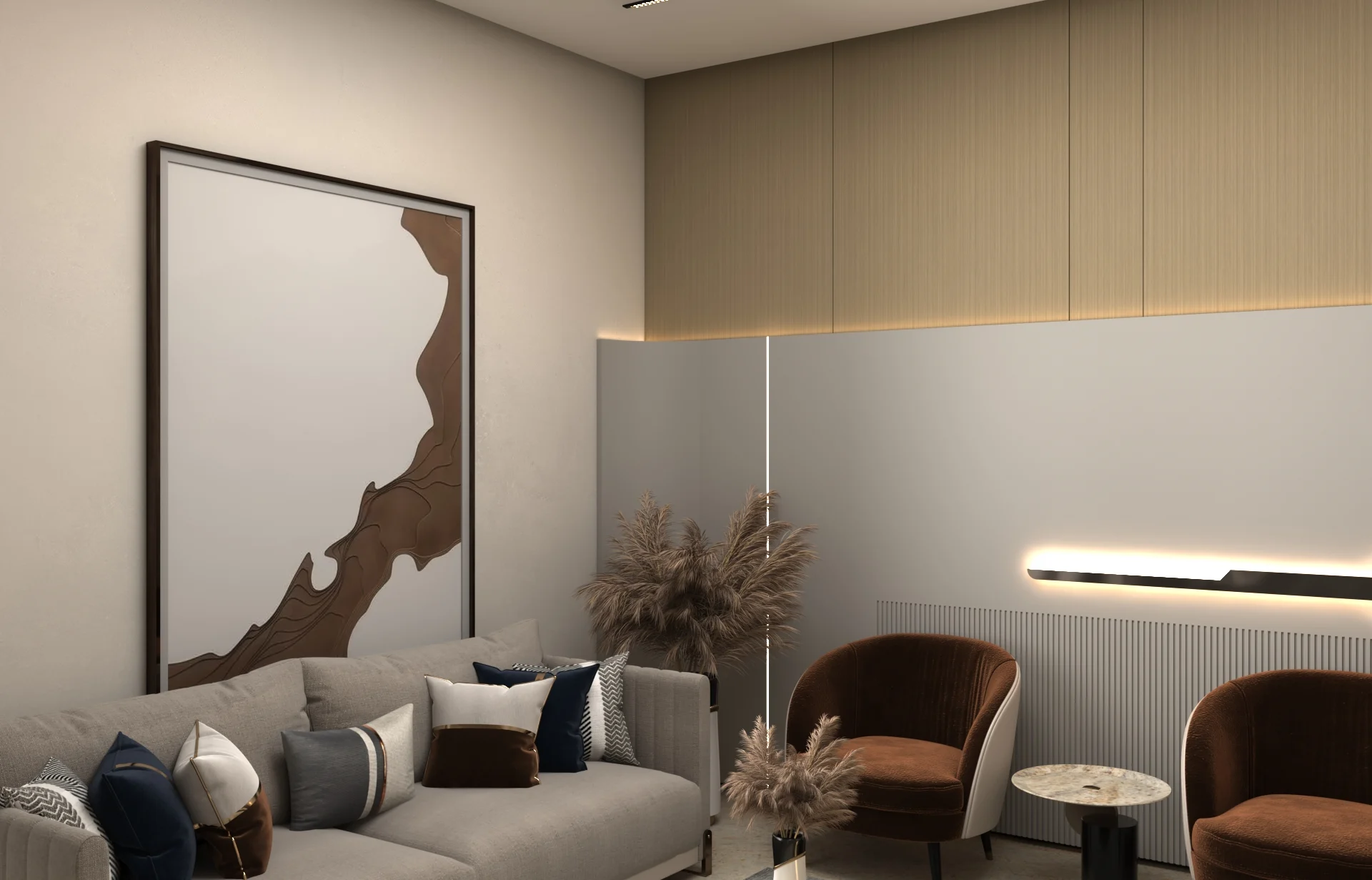 يتبنى مشروع مقام فلسفة تصميم داخلي تجمع ببراعة بين الهدوء العصري في بعض الفراغات (كالمطابخ والأركان ذات الألوان الفاتحة) والدراما البصرية الفاخرة في فراغات أخرى (كغرف المعيشة والنوم الرئيسية). تتميز الشقة بتنوع استخدام الخامات الراقية؛ حيث نجد الرخام الفاتح ذو العروق البارزة، والأخشاب الداكنة والجدران المُغطاة بألواح خشبية عميقة اللون. في الغرف الهادئة، تُستخدم الألوان المحايدة الدافئة مع لمسات إضاءة خفية لتعزيز الشعور بالسكينة والعملية. بينما في الفراغات الجريئة، يتم التركيز على الأثاث المترف ذي الخطوط العميقة والمنحنية، واللمسات المعدنية المصقولة (كالذهب والنحاس) التي تظهر في الإضاءة المركزية والتفاصيل الجانبية. هذا التباين المدروس يمنح الشقة هوية بصرية قوية ومزدوجة، تجمع بين الوظائفية اليومية في إطار من الرفاهية المتميزة.