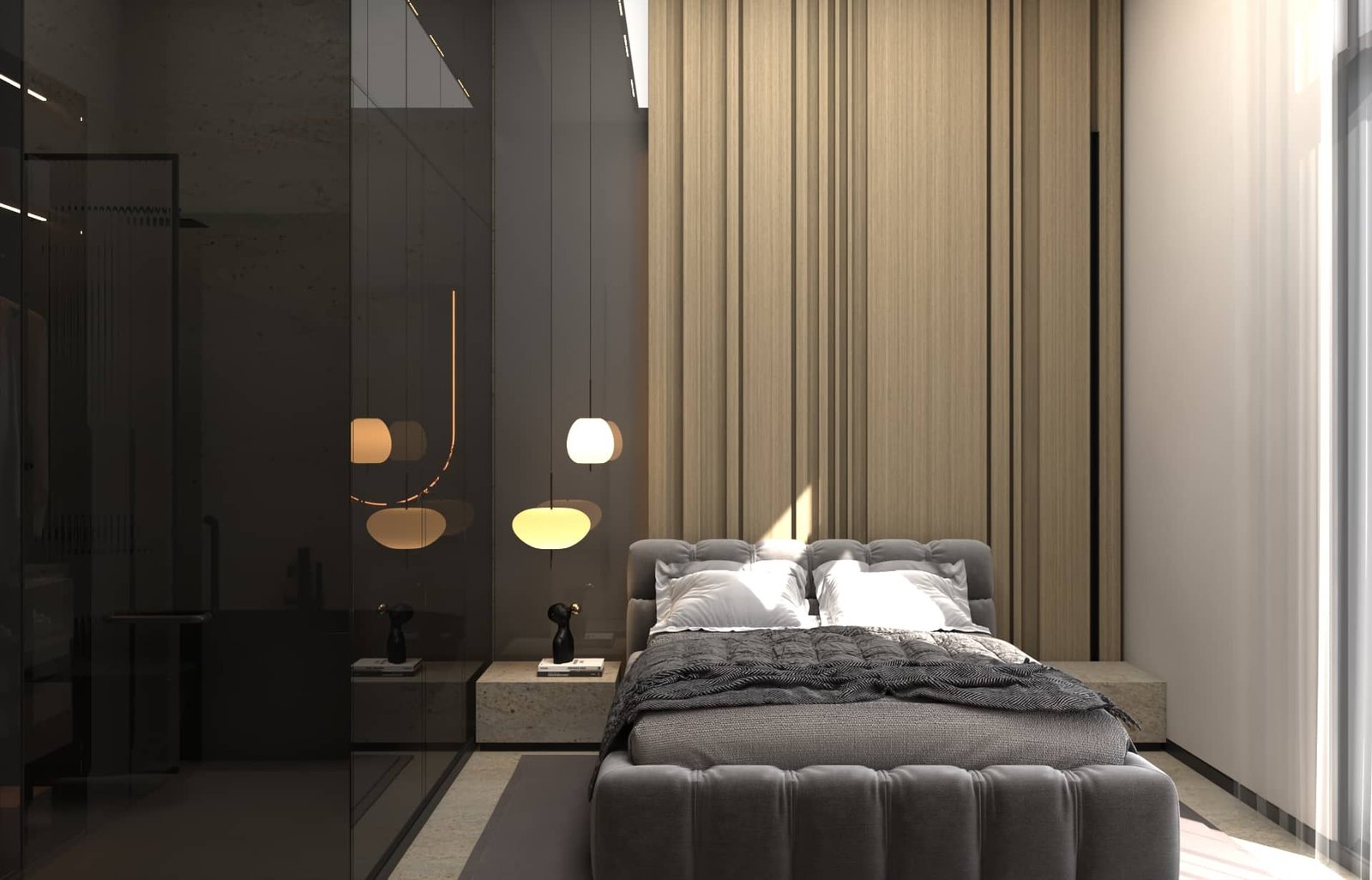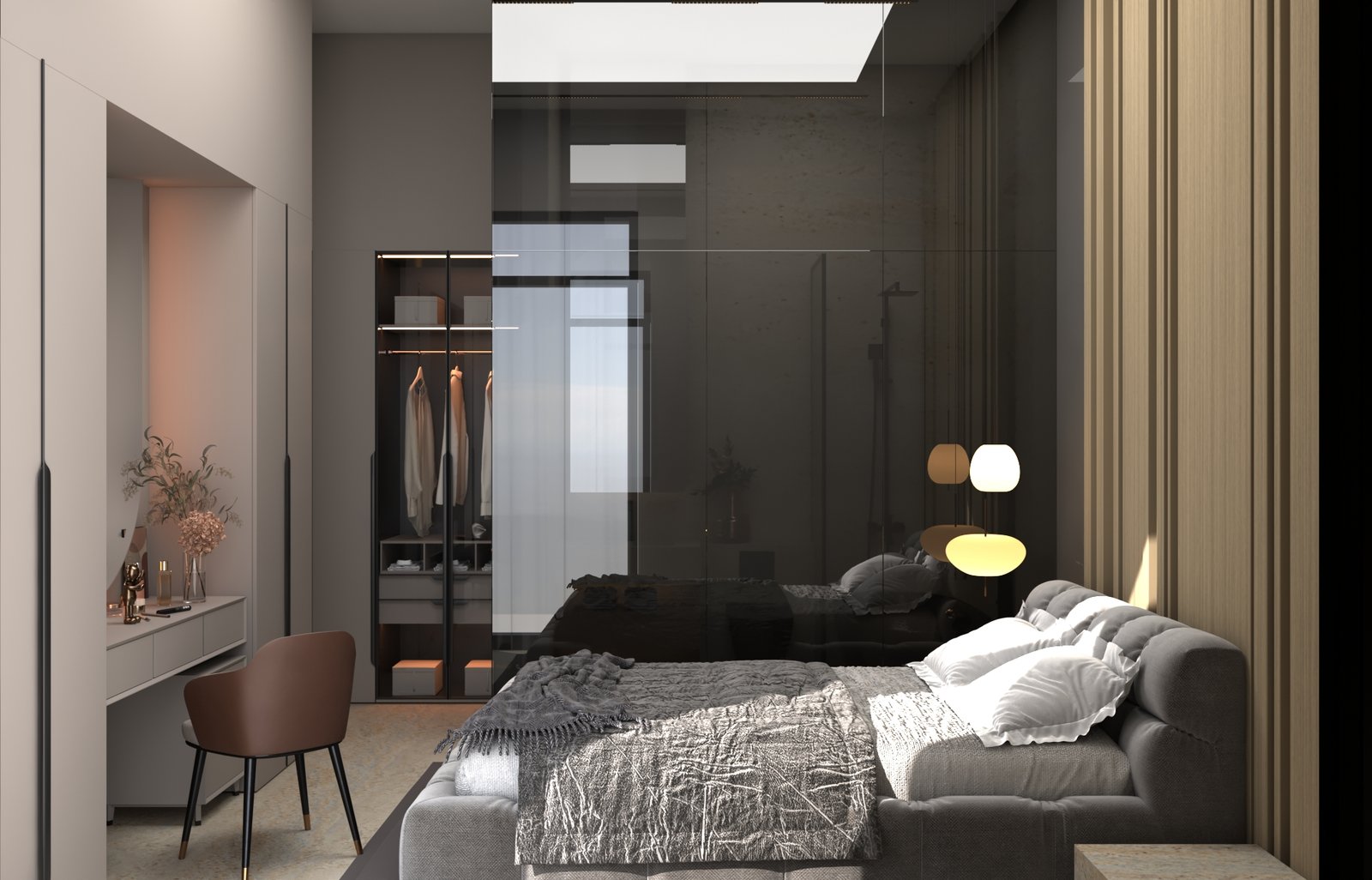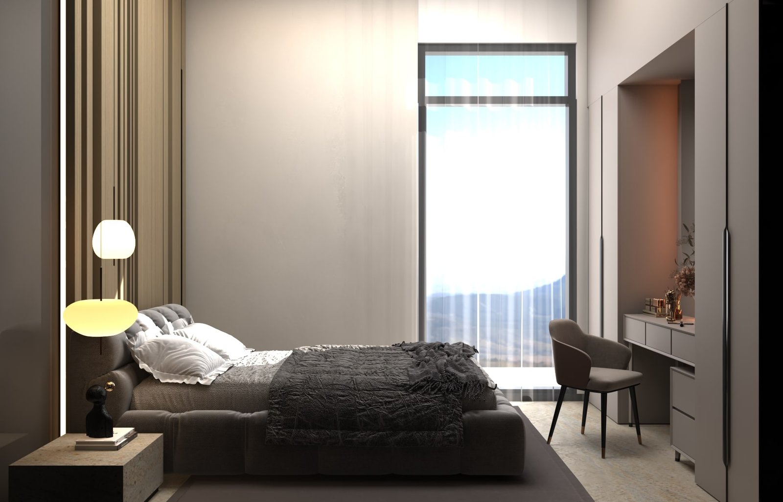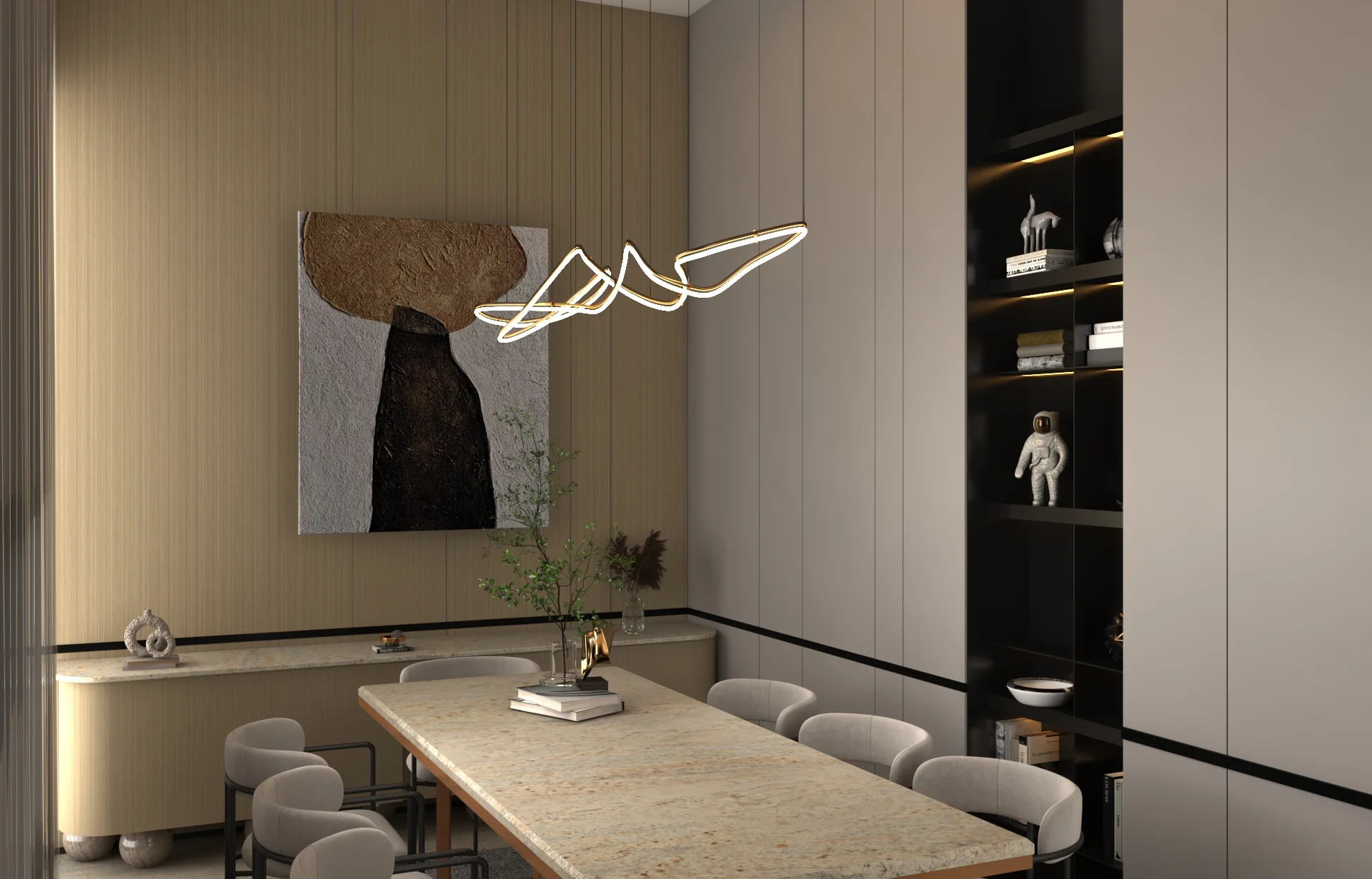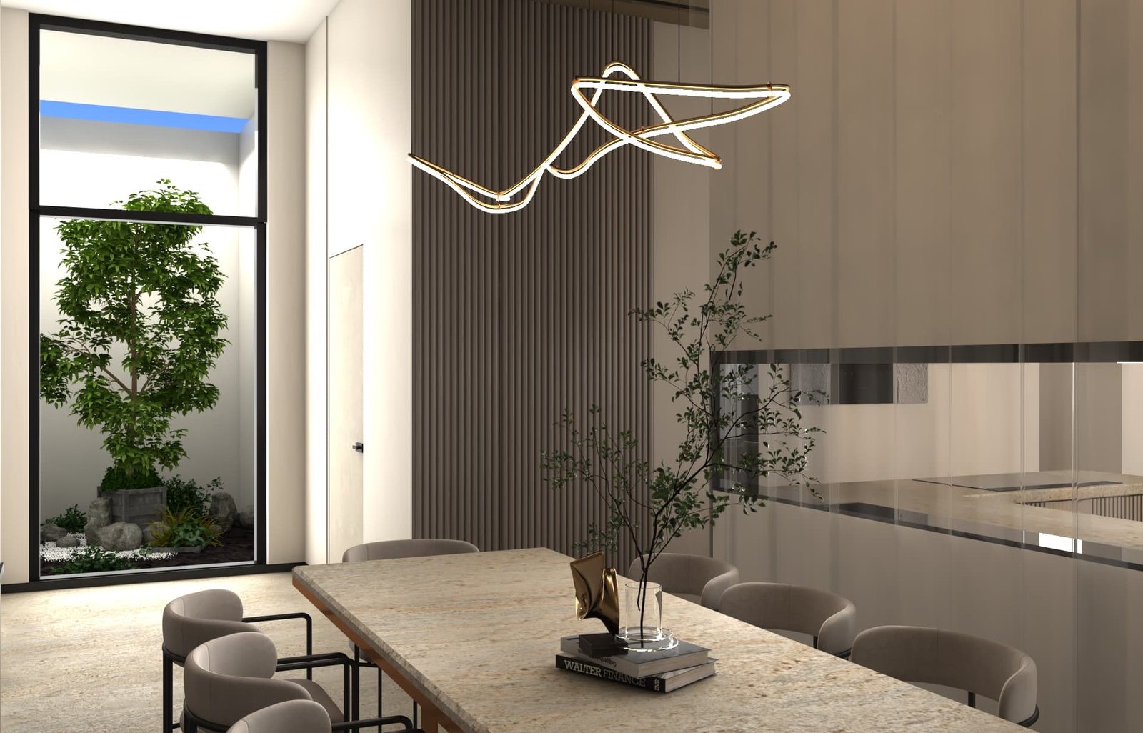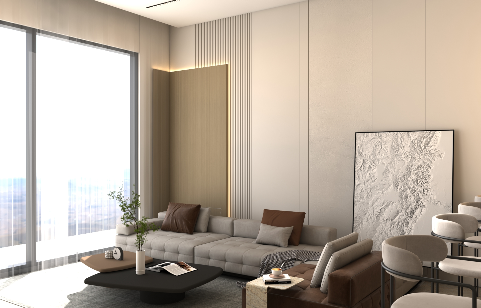 يتبنى مشروع مقام فلسفة تصميم داخلي تجمع ببراعة بين الهدوء العصري في بعض الفراغات (كالمطابخ والأركان ذات الألوان الفاتحة) والدراما البصرية الفاخرة في فراغات أخرى (كغرف المعيشة والنوم الرئيسية). تتميز الشقة بتنوع استخدام الخامات الراقية؛ حيث نجد الرخام الفاتح ذو العروق البارزة، والأخشاب الداكنة والجدران المُغطاة بألواح خشبية عميقة اللون. في الغرف الهادئة، تُستخدم الألوان المحايدة الدافئة مع لمسات إضاءة خفية لتعزيز الشعور بالسكينة والعملية. بينما في الفراغات الجريئة، يتم التركيز على الأثاث المترف ذي الخطوط العميقة والمنحنية، واللمسات المعدنية المصقولة (كالذهب والنحاس) التي تظهر في الإضاءة المركزية والتفاصيل الجانبية. هذا التباين المدروس يمنح الشقة هوية بصرية قوية ومزدوجة، تجمع بين الوظائفية اليومية في إطار من الرفاهية المتميزة.