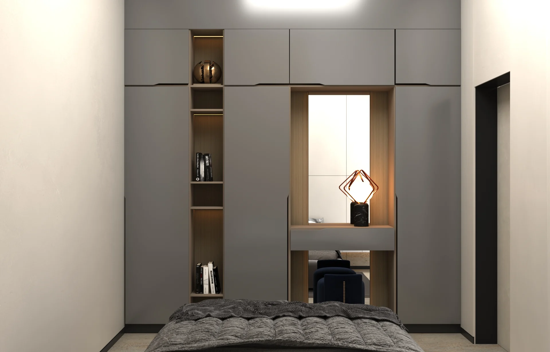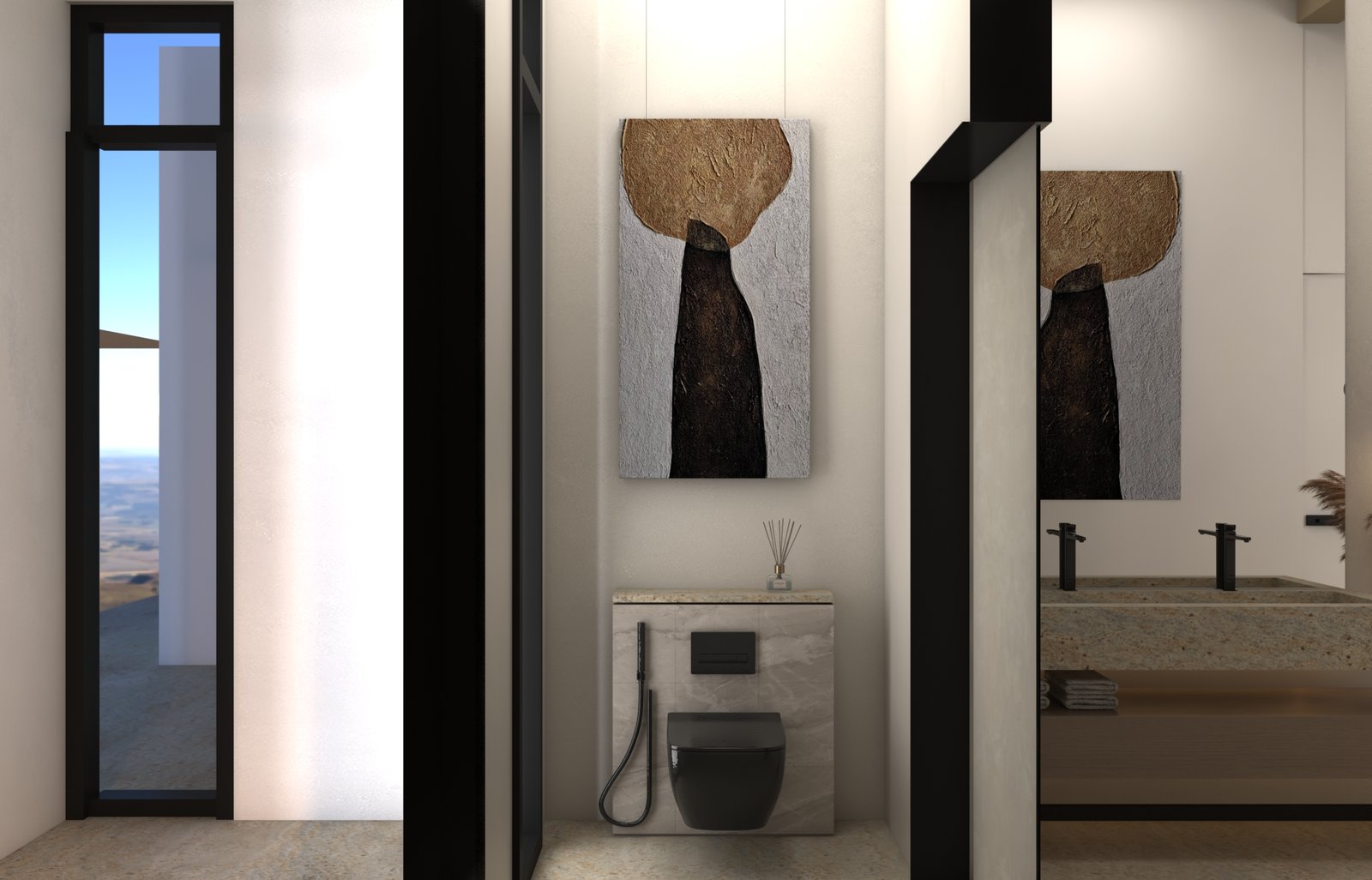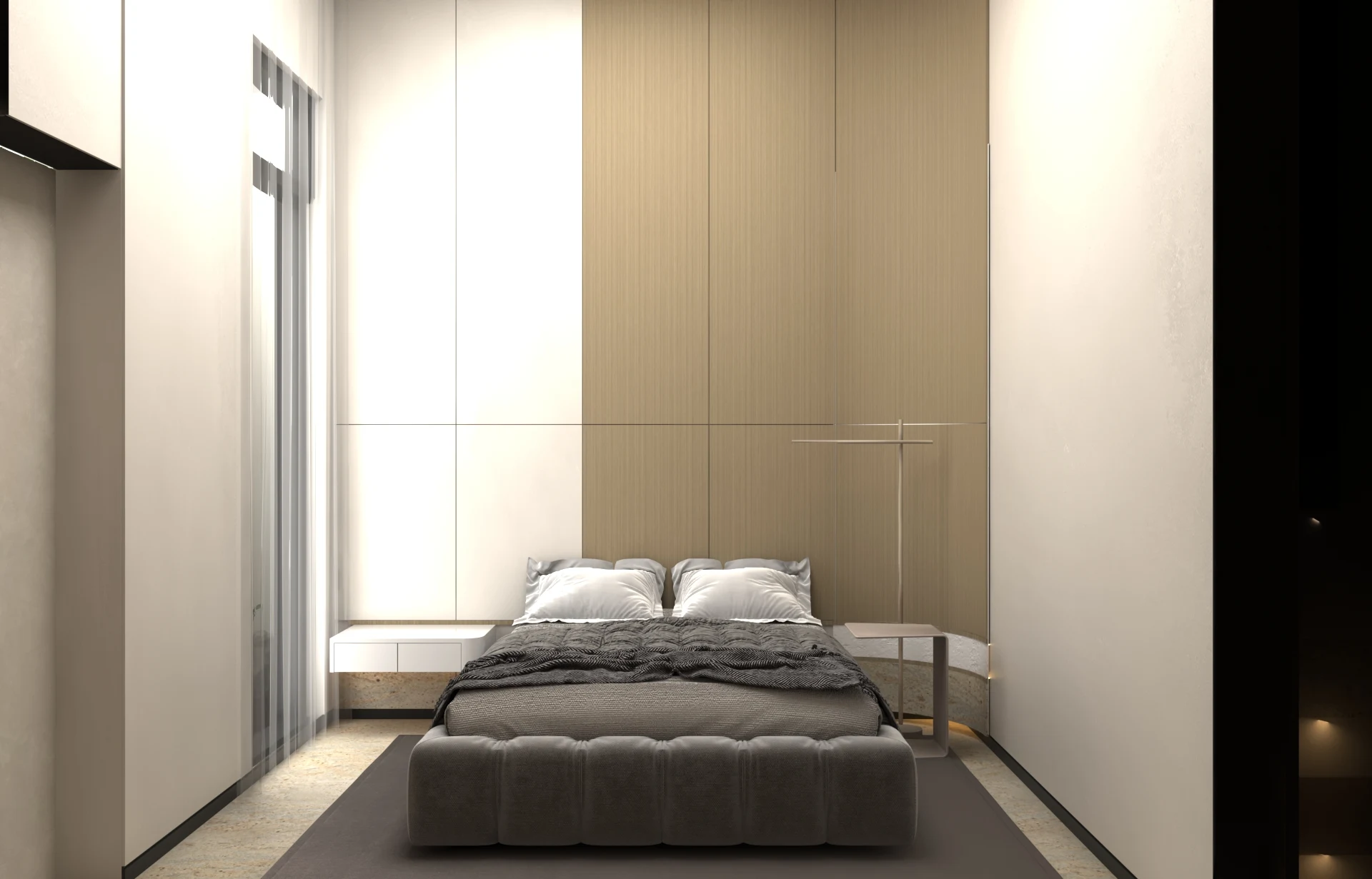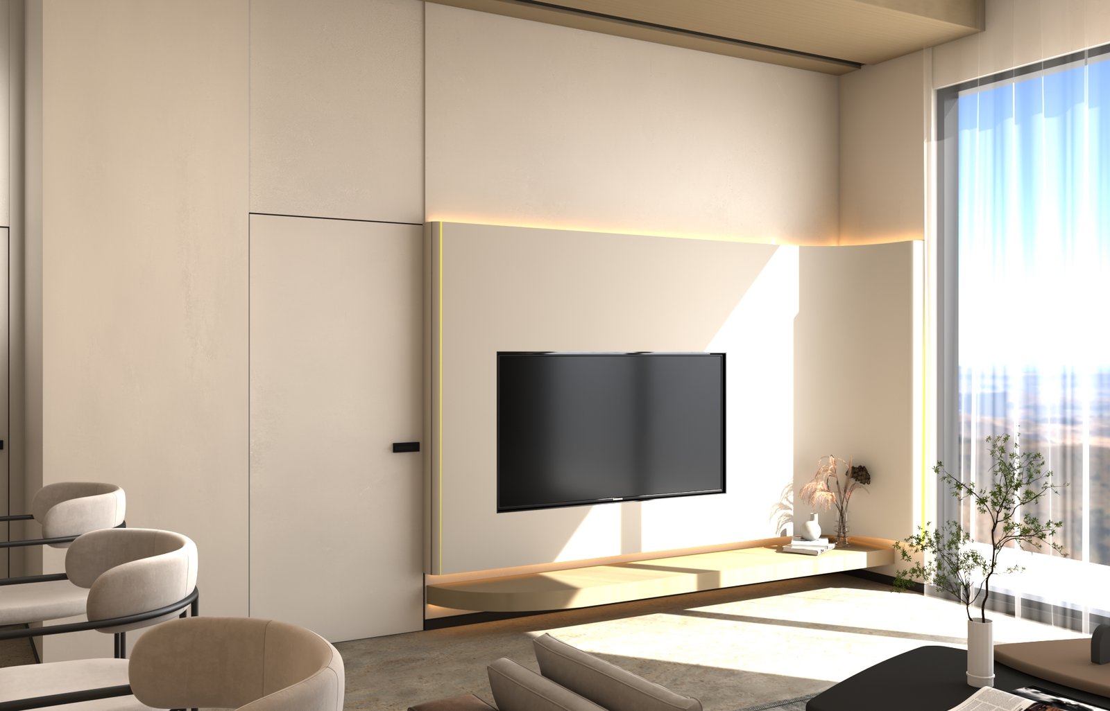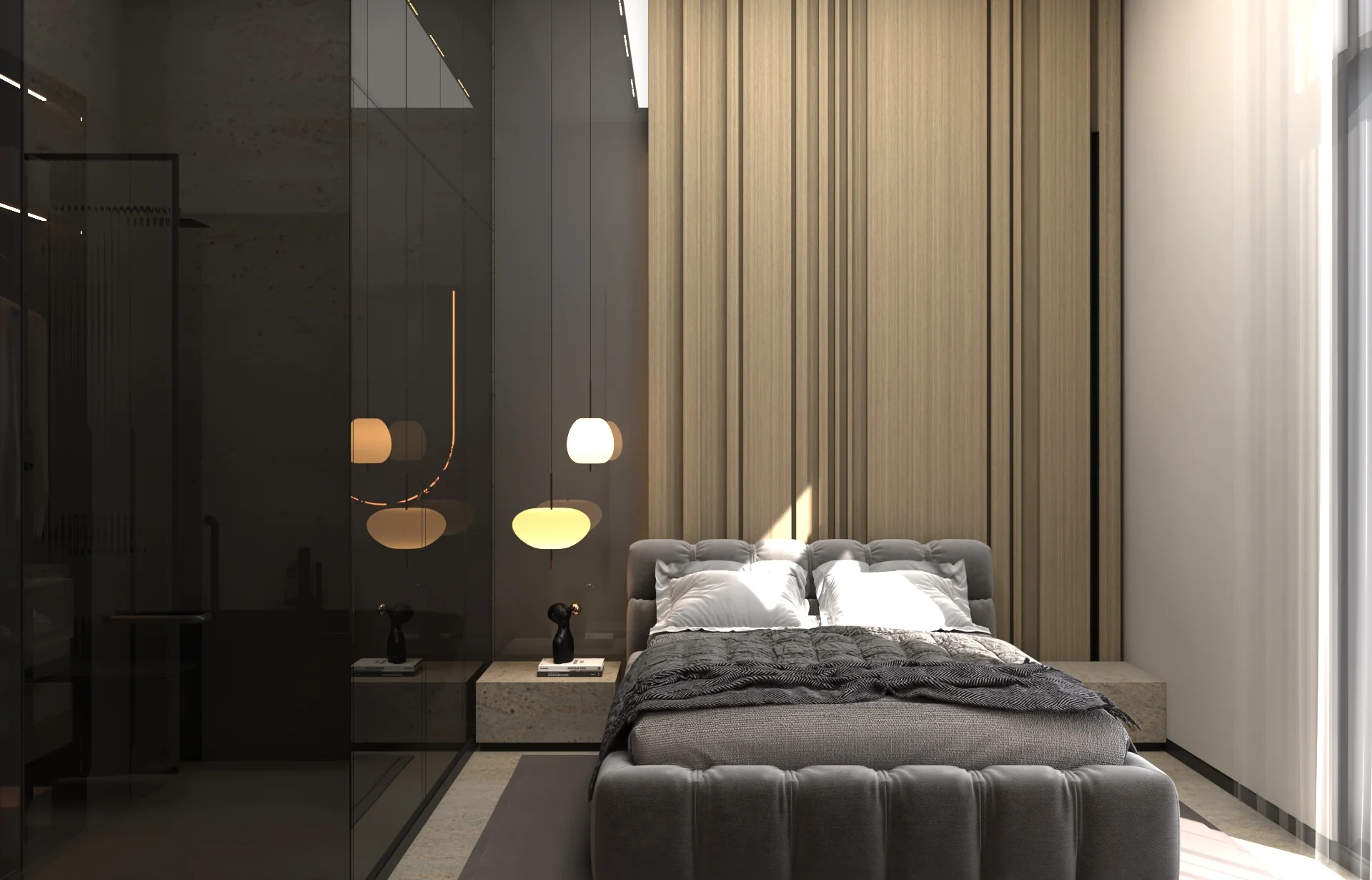 يتبنى مشروع مقام فلسفة تصميم داخلي تجمع ببراعة بين الهدوء العصري في بعض الفراغات (كالمطابخ والأركان ذات الألوان الفاتحة) والدراما البصرية الفاخرة في فراغات أخرى (كغرف المعيشة والنوم الرئيسية). تتميز الشقة بتنوع استخدام الخامات الراقية؛ حيث نجد الرخام الفاتح ذو العروق البارزة، والأخشاب الداكنة والجدران المُغطاة بألواح خشبية عميقة اللون. في الغرف الهادئة، تُستخدم الألوان المحايدة الدافئة مع لمسات إضاءة خفية لتعزيز الشعور بالسكينة والعملية. بينما في الفراغات الجريئة، يتم التركيز على الأثاث المترف ذي الخطوط العميقة والمنحنية، واللمسات المعدنية المصقولة (كالذهب والنحاس) التي تظهر في الإضاءة المركزية والتفاصيل الجانبية. هذا التباين المدروس يمنح الشقة هوية بصرية قوية ومزدوجة، تجمع بين الوظائفية اليومية في إطار من الرفاهية المتميزة.