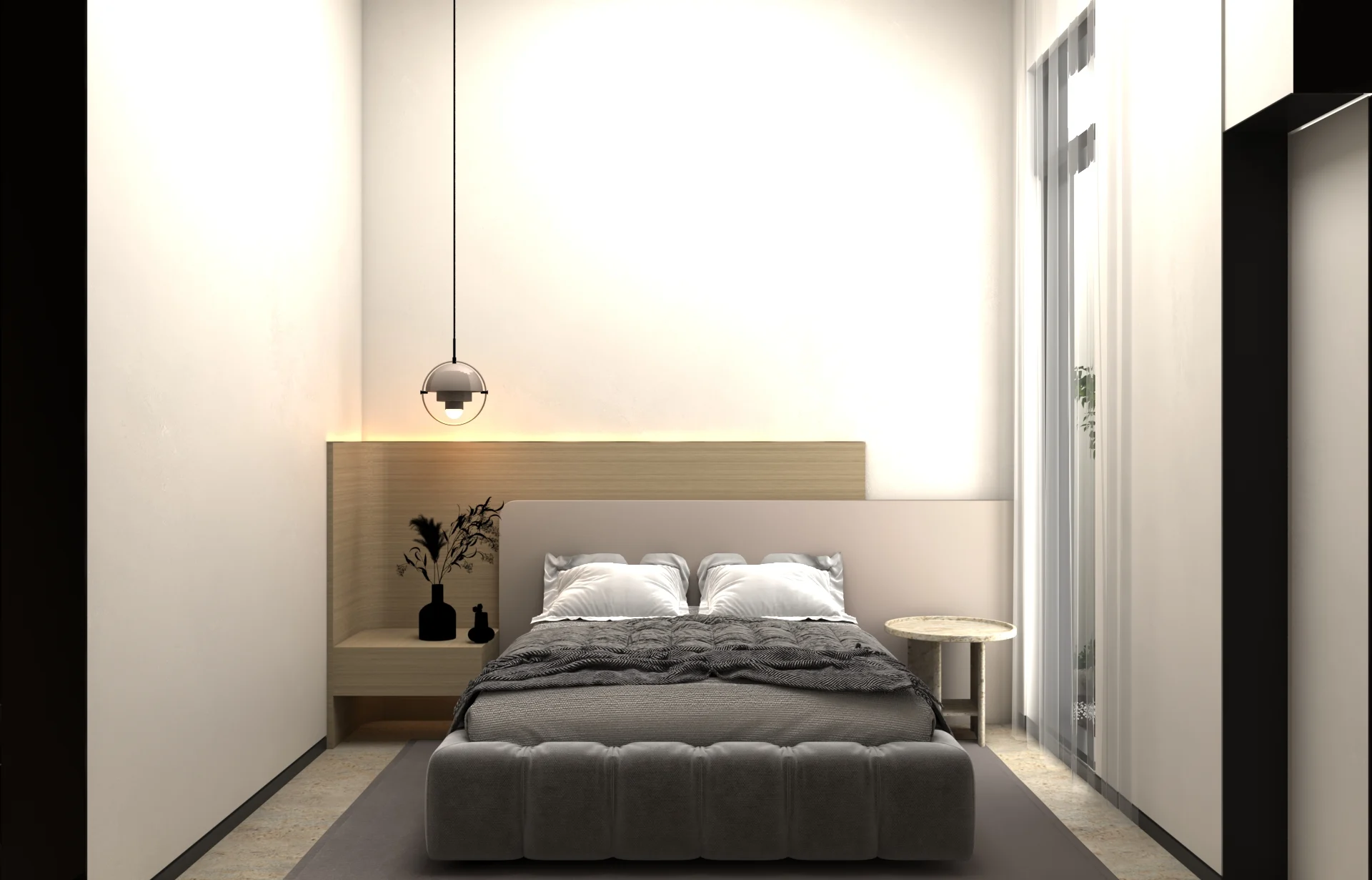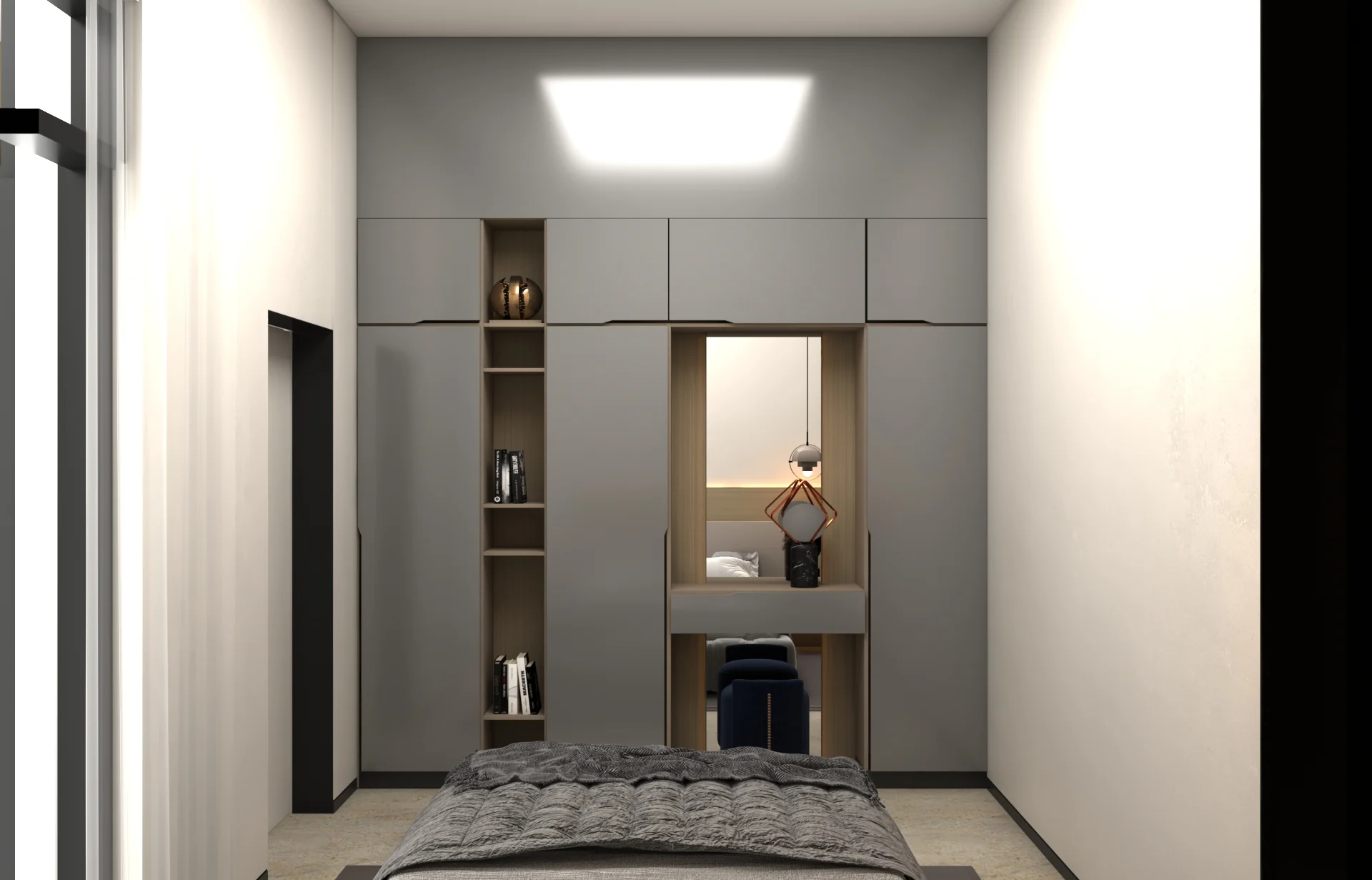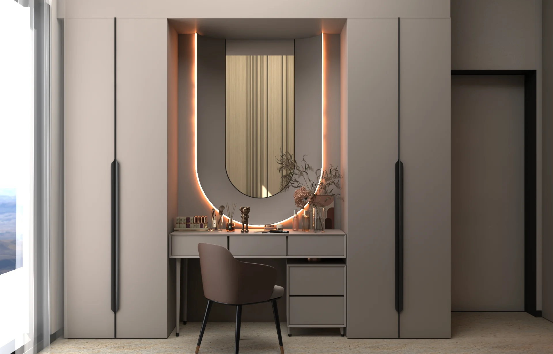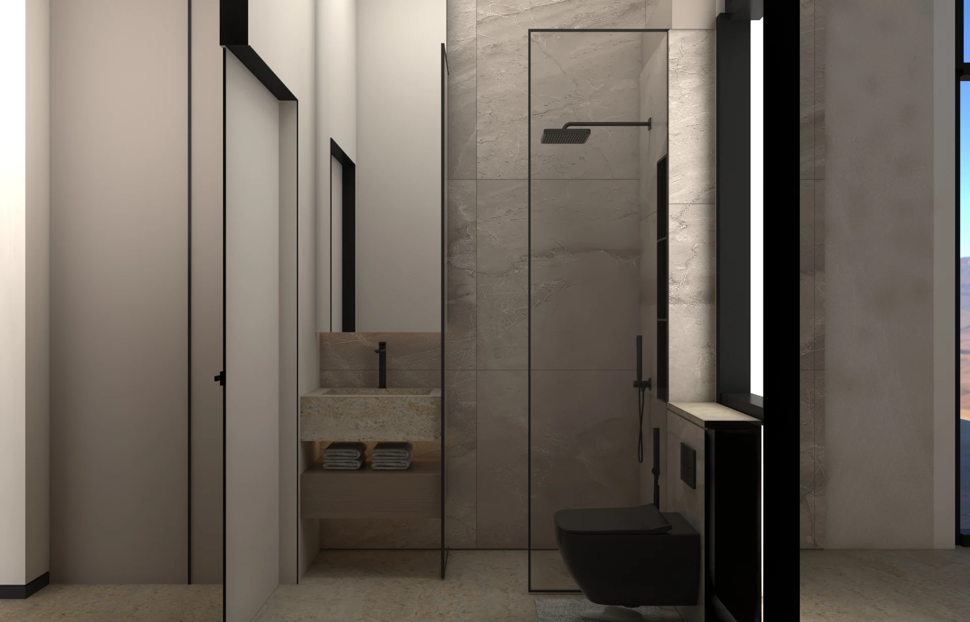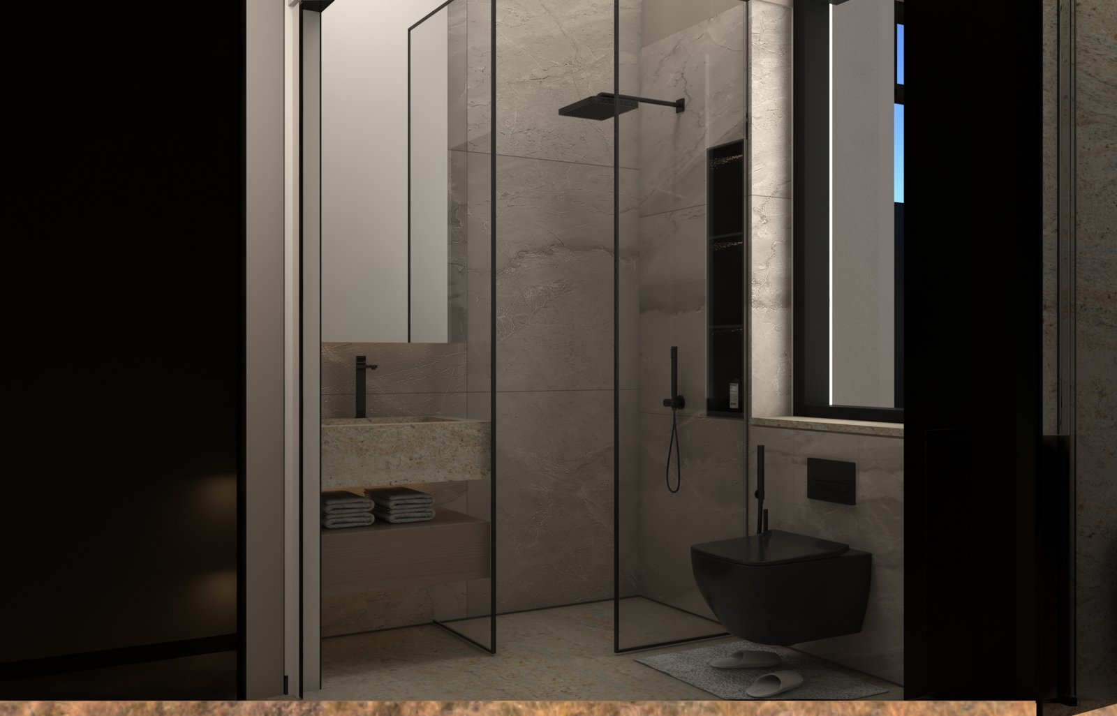 يتبنى مشروع مقام فلسفة تصميم داخلي تجمع ببراعة بين الهدوء العصري في بعض الفراغات (كالمطابخ والأركان ذات الألوان الفاتحة) والدراما البصرية الفاخرة في فراغات أخرى (كغرف المعيشة والنوم الرئيسية). تتميز الشقة بتنوع استخدام الخامات الراقية؛ حيث نجد الرخام الفاتح ذو العروق البارزة، والأخشاب الداكنة والجدران المُغطاة بألواح خشبية عميقة اللون. في الغرف الهادئة، تُستخدم الألوان المحايدة الدافئة مع لمسات إضاءة خفية لتعزيز الشعور بالسكينة والعملية. بينما في الفراغات الجريئة، يتم التركيز على الأثاث المترف ذي الخطوط العميقة والمنحنية، واللمسات المعدنية المصقولة (كالذهب والنحاس) التي تظهر في الإضاءة المركزية والتفاصيل الجانبية. هذا التباين المدروس يمنح الشقة هوية بصرية قوية ومزدوجة، تجمع بين الوظائفية اليومية في إطار من الرفاهية المتميزة.