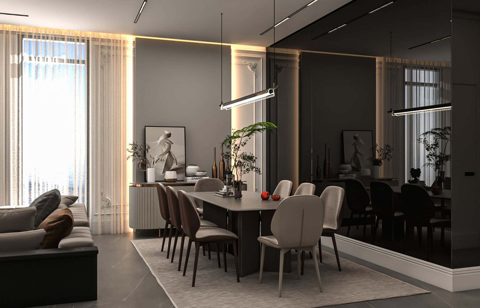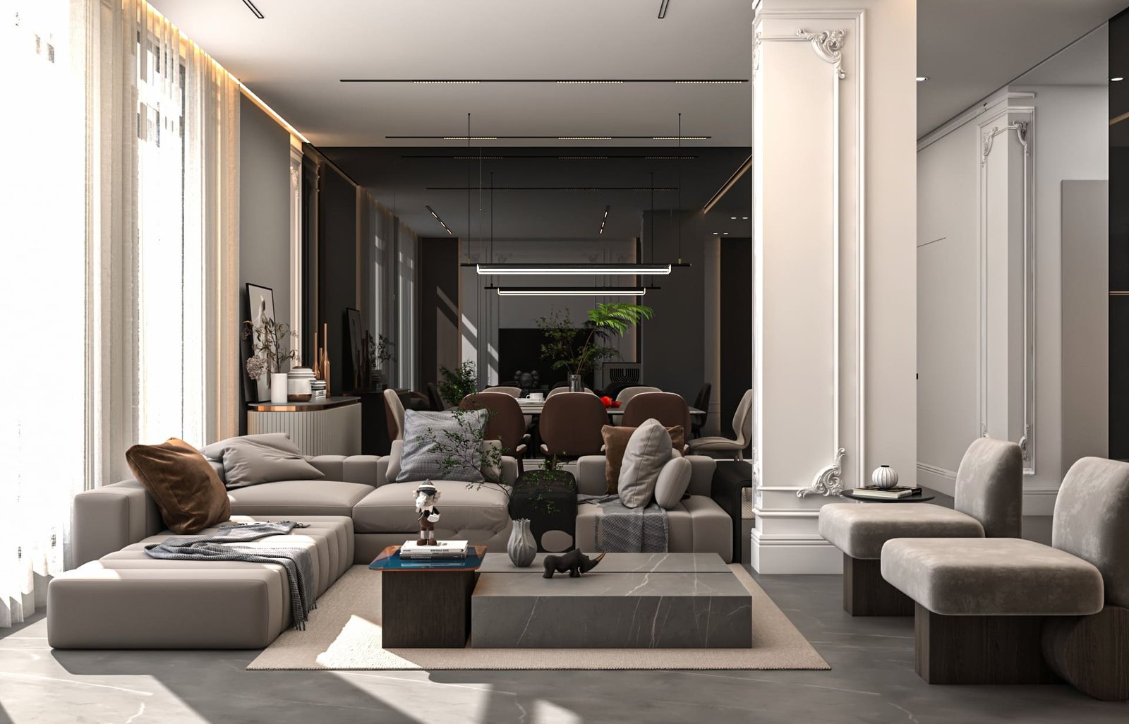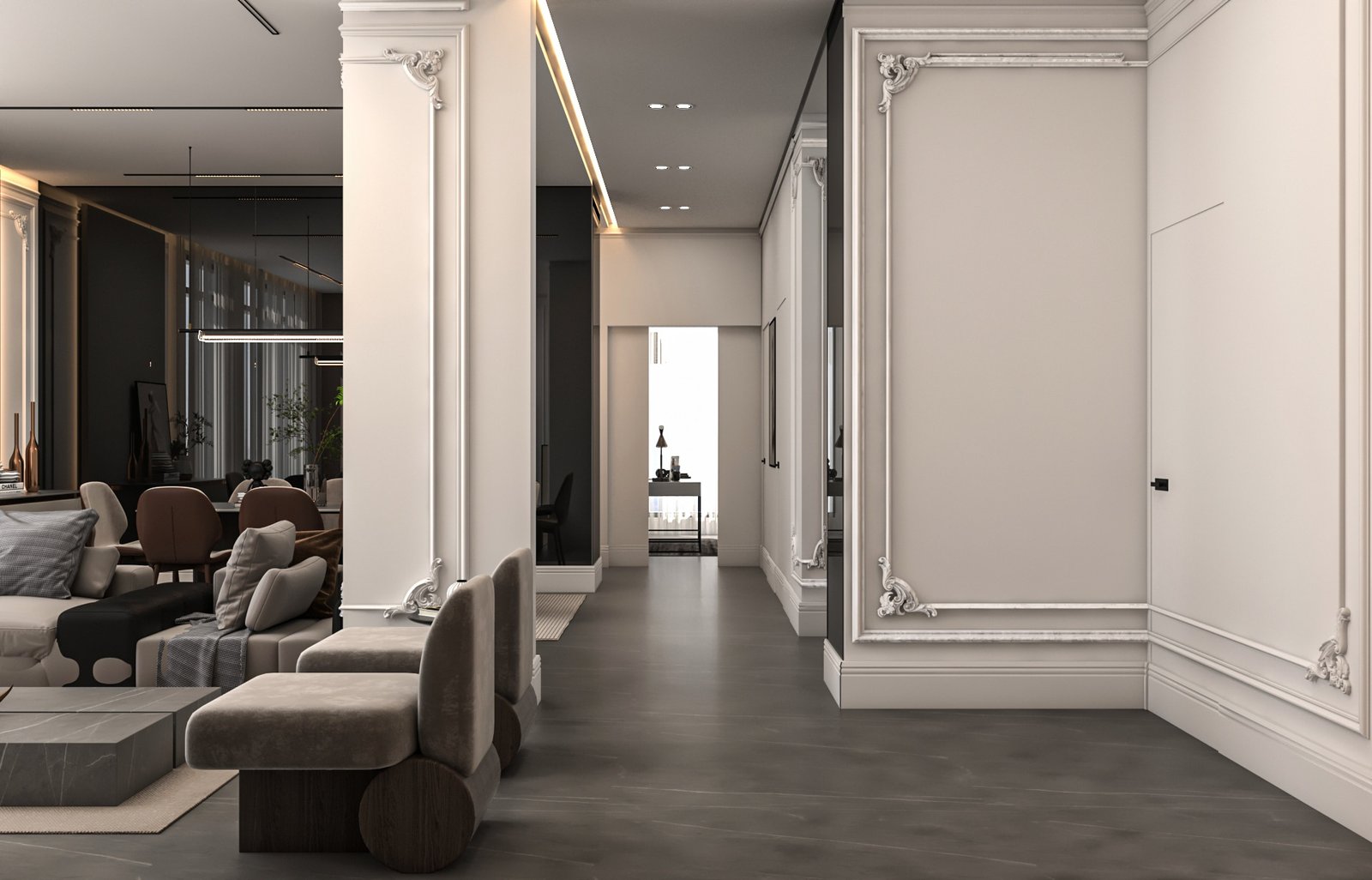 تامة، مما أزال الإحساس بالتجزئة وأعطى الشقة امتدادًا بصريًا مريحًا. تم اختيار قطع أثاث متعددة الاستخدام.