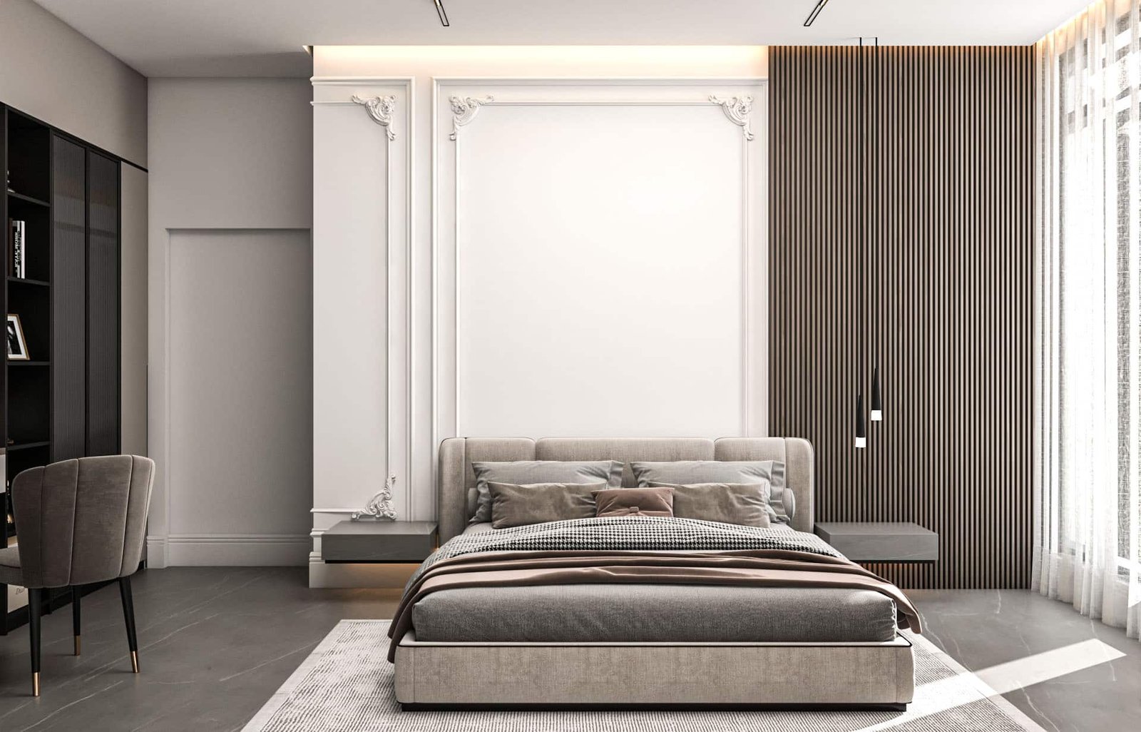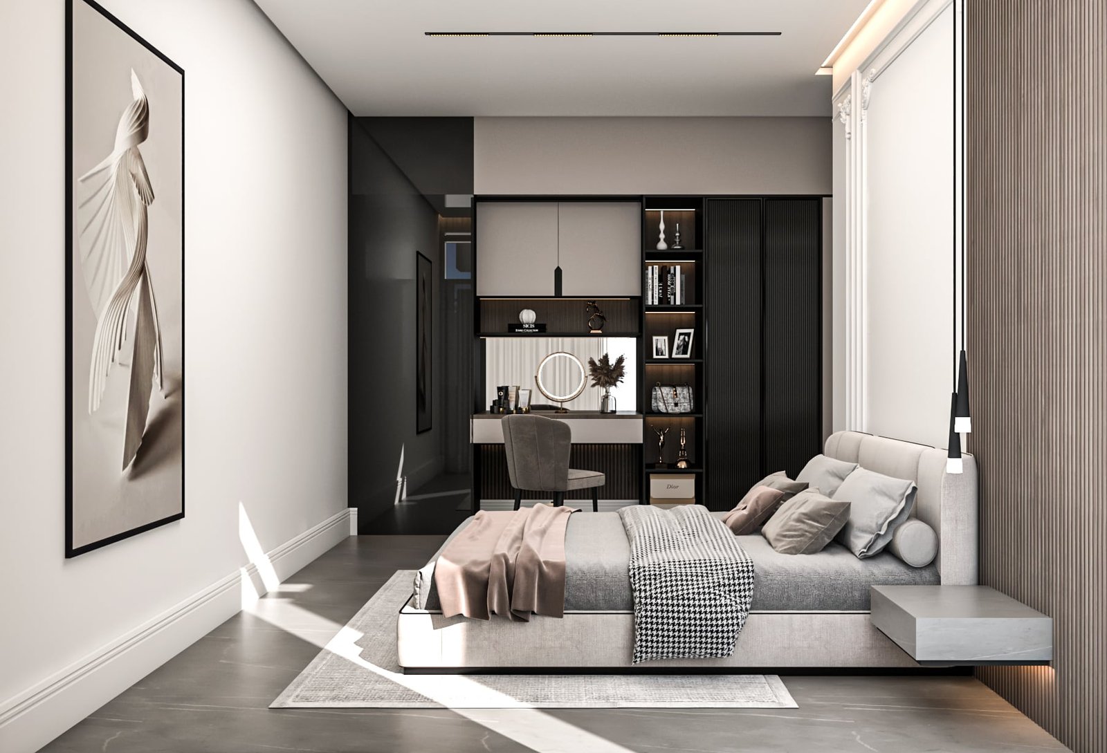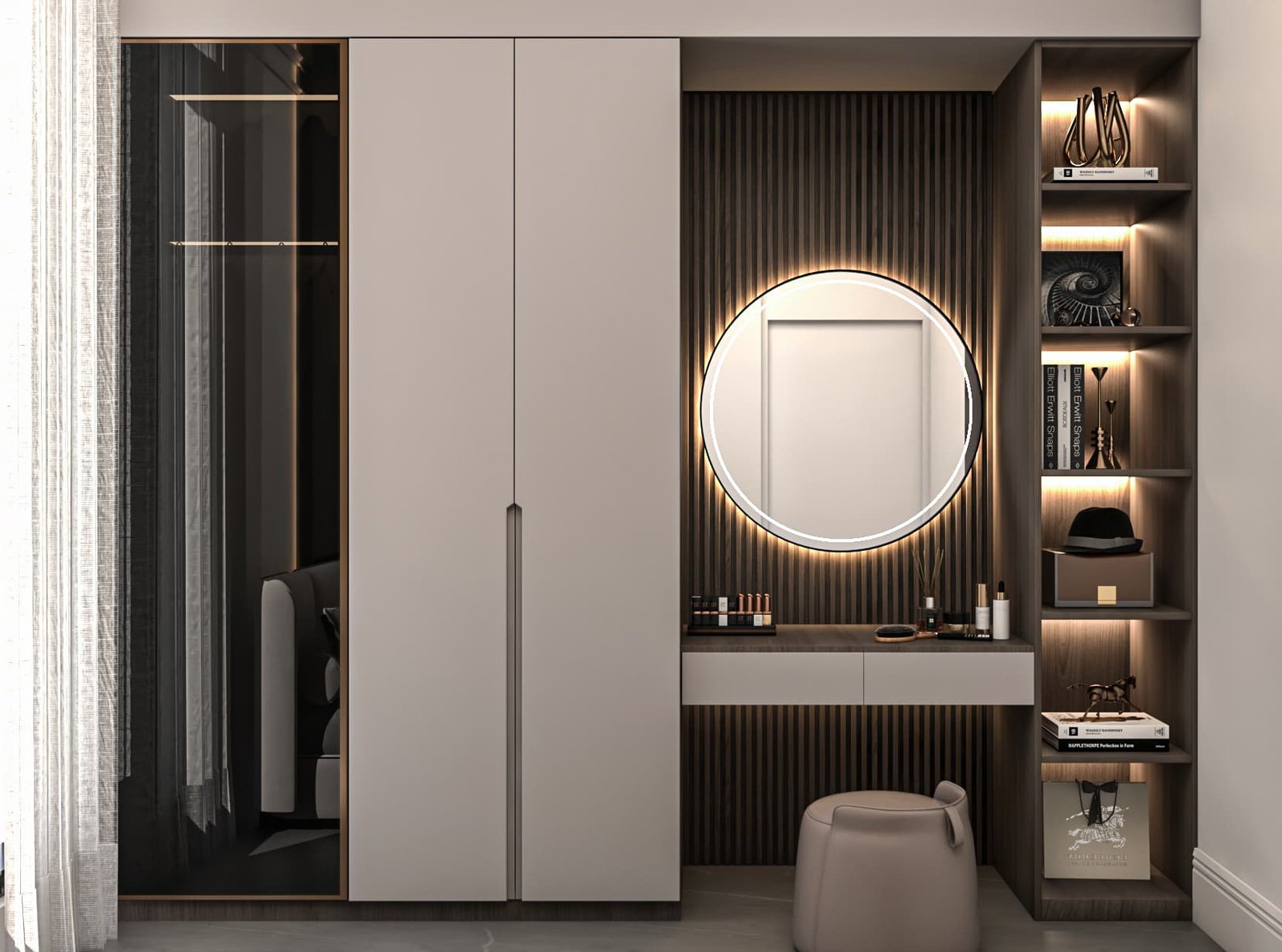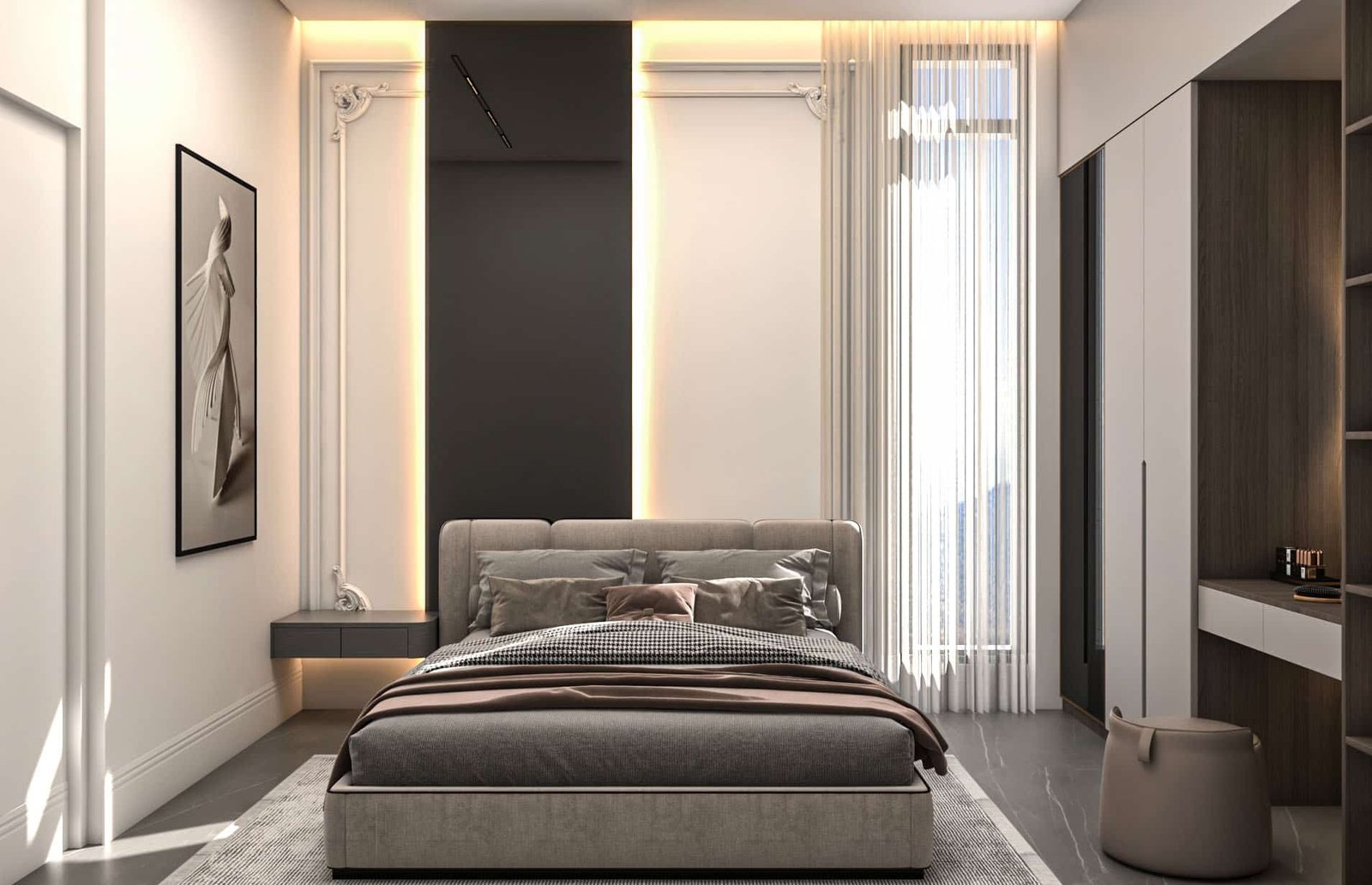 تامة، مما أزال الإحساس بالتجزئة وأعطى الشقة امتدادًا بصريًا مريحًا. تم اختيار قطع أثاث متعددة الاستخدام.