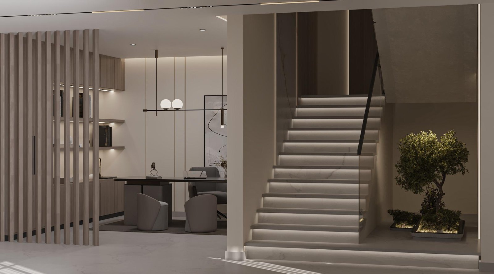 في مشروع عُلا بالخبر، تم تصميم فراغ فاخر وأنيق يركز على الدفء الطبيعي والخامات البسيطة لتعزيز التداول السلس بين الفراغات. ويجمع التصميم الداخلي ببراعة بين الرفاهية والراحة اليومية، عبر دمج الأخشاب الفاتحة والألوان المحايدة لتعظيم الإحساس بالرحابة والتدفق في الحركة. هذا التوظيف الذكي للإضاءة المخفية والمواد ذات الجودة العالية يحقق جودة استخدام وجمالية عصرية.