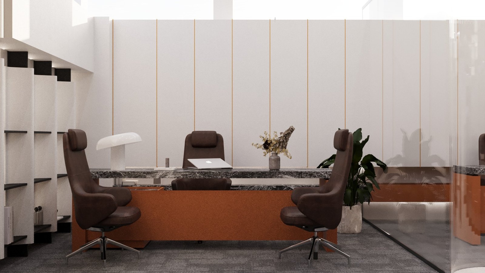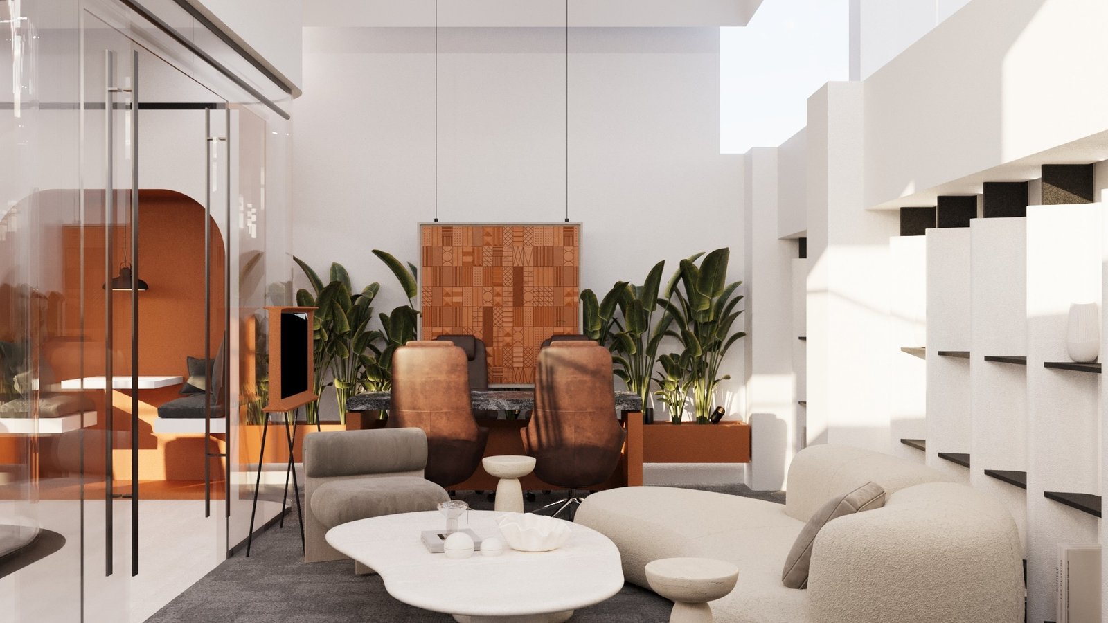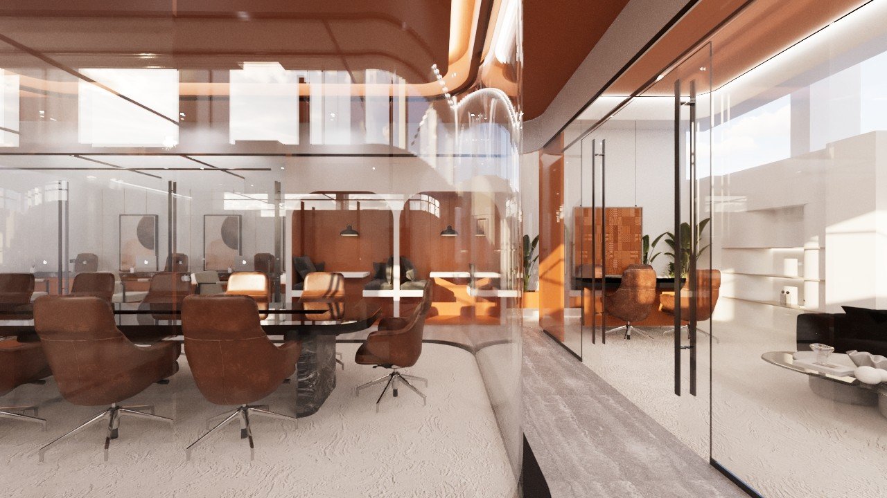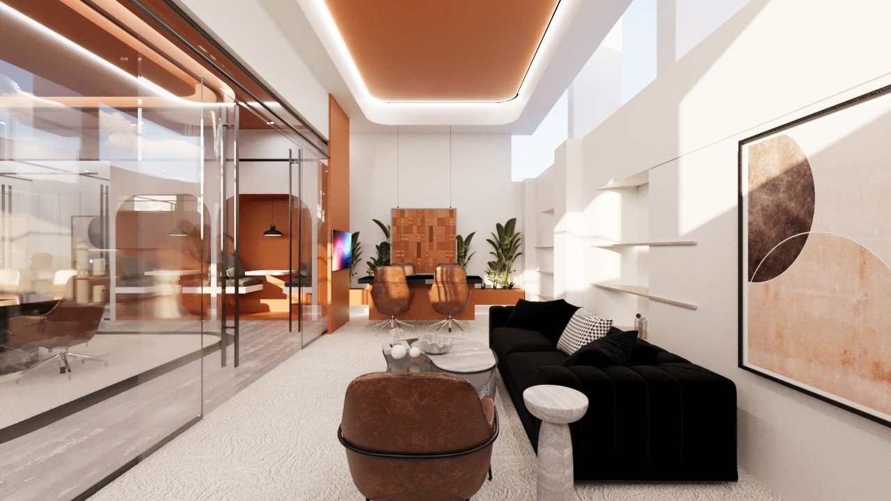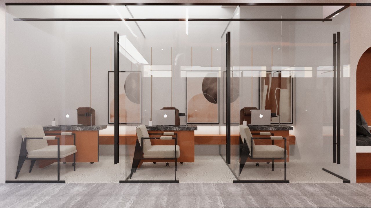 عمل فريقنا على تطوير تصميم داخلي لمكاتب عصرية اعتمدنا فيها على روح المودرن كلغة تصميم أساسية، مع استخدام اللون الأورانج كعنصر بصري محوري يعكس الحيوية والطاقة داخل بيئة العمل. كان الهدف خلق مكاتب مريحة، محفّزة، وواضحة في هويتها، تجمع بين العملية والجمالية بأسلوب معاصر.اعتمدنا في التكوين العام على خطوط نظيفة ومساحات مفتوحة لتعزيز التواصل بين الفرق وتقليل الحواجز البصرية. جاءت الألوان المحايدة وتدرجات الخشب كركيزة أساسية تمنح الهدوء، بينما ظهر الأورانج في نقاط مدروسة: في الجدران المميّزة، غرف الاجتماعات، لمسات الفرش، والعناصر الإرشادية، ليضيف دفئًا وطاقة إيجابية تدعم بيئة العمل.